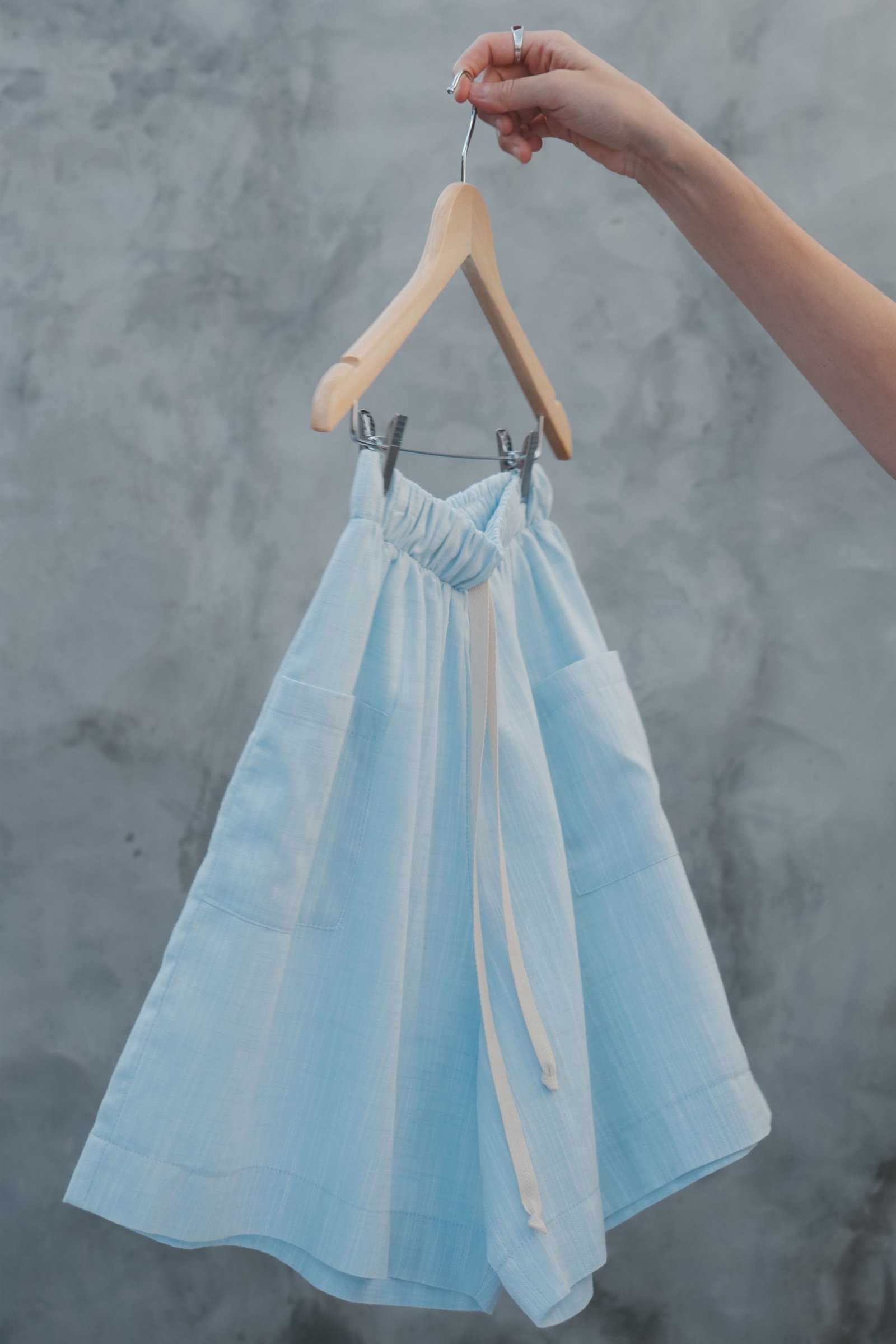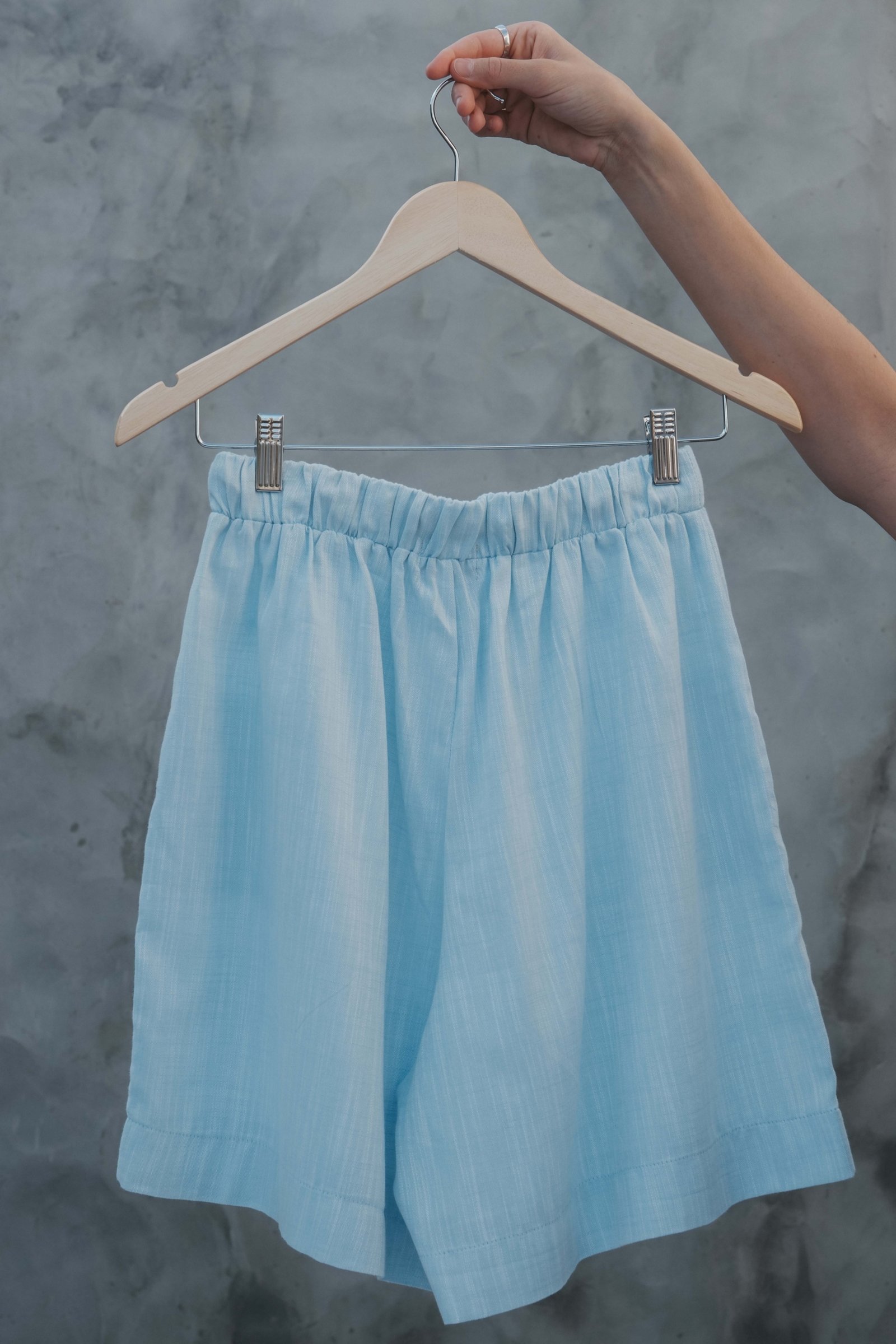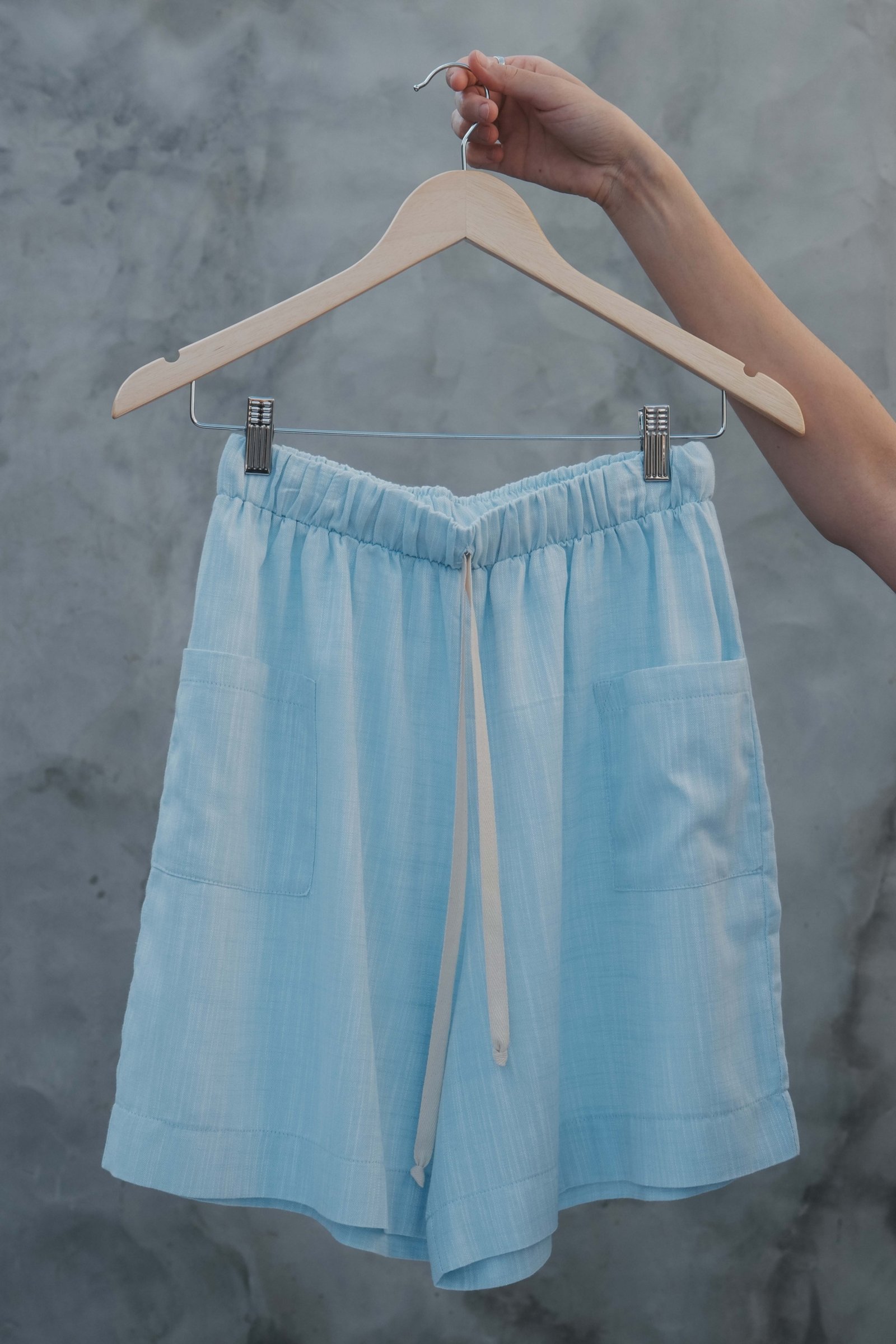 O shorts azul Caliandra é fruto de refugo da indústria e pertencente a nossa cápsula Cigarra. É leve e tem movimento, cós alto com elástico, modelagem ampla.Possui dois bolsos frontais e cadarço em algodão.