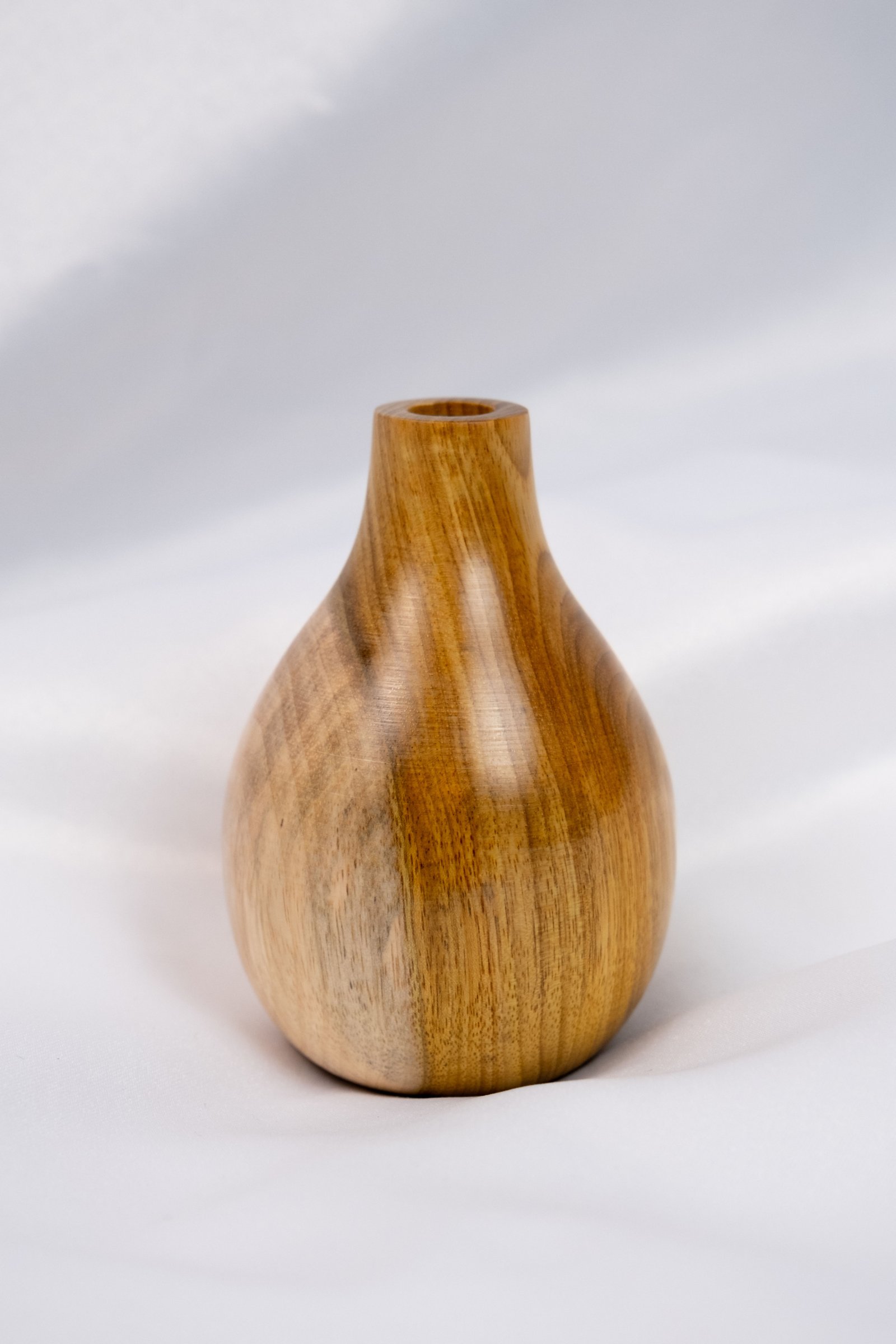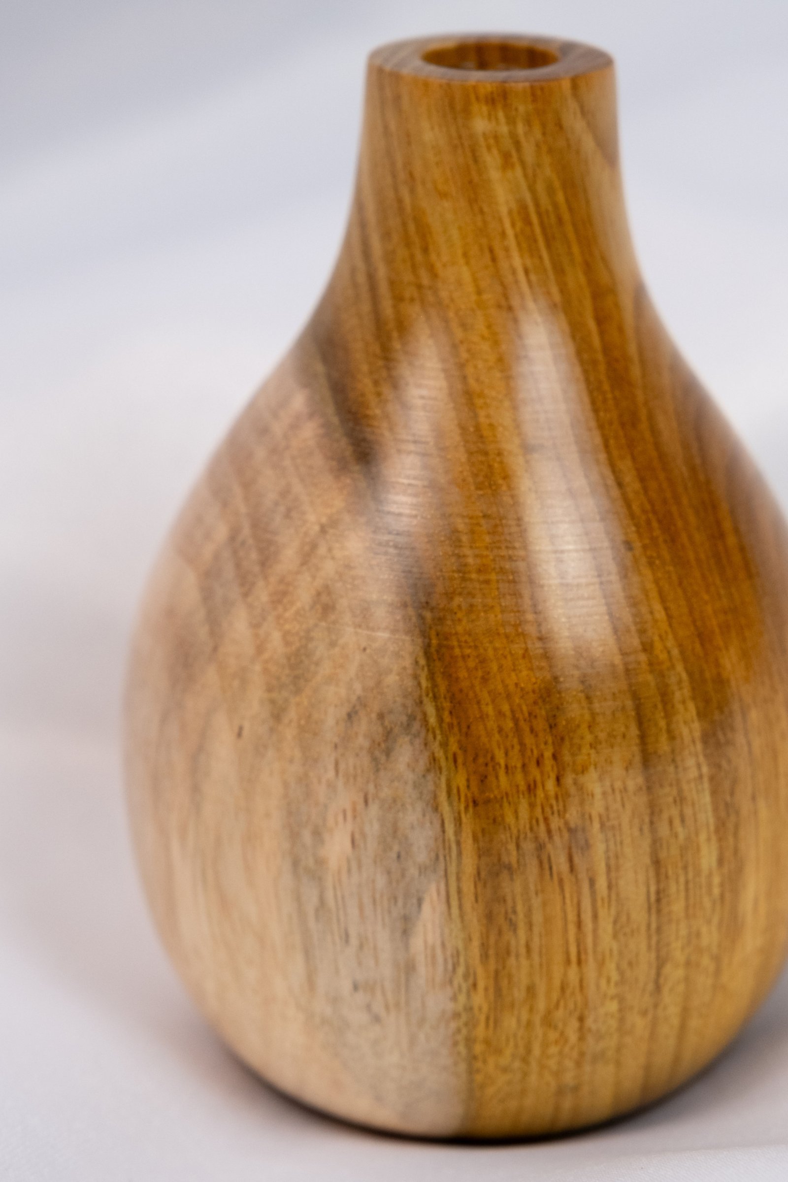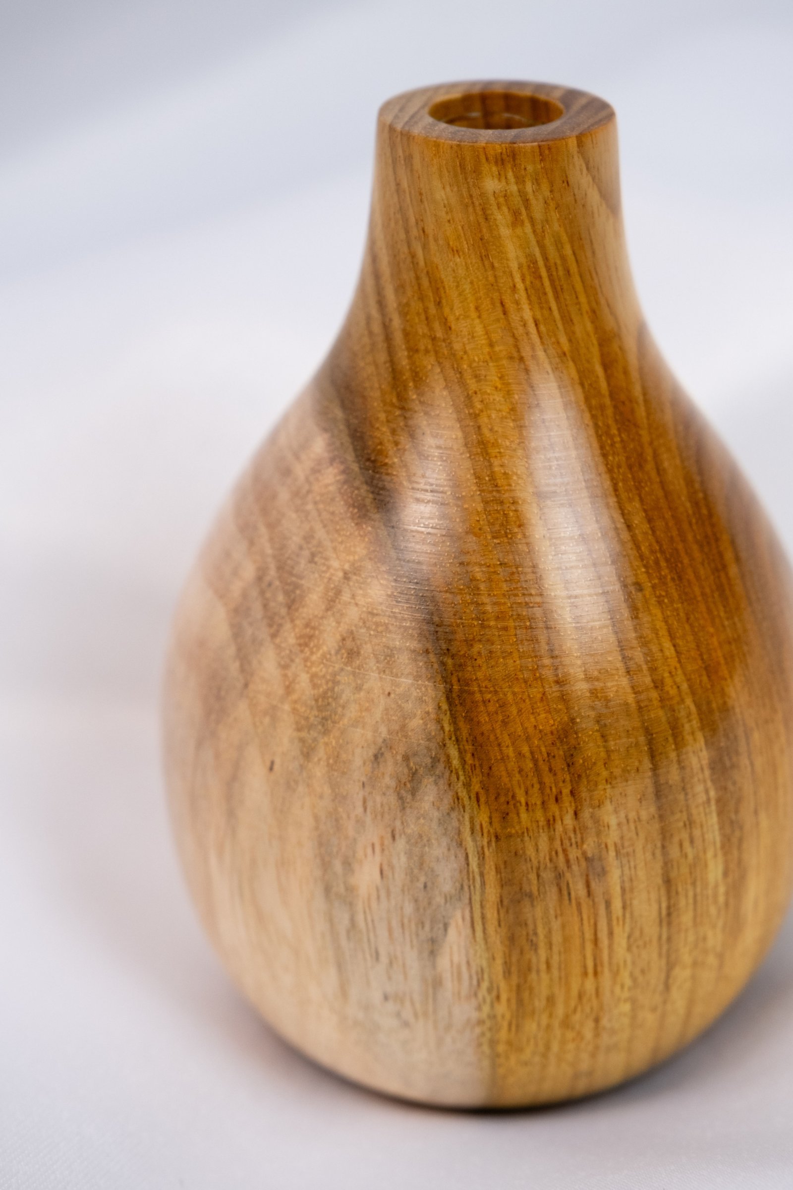 Vaso de madeira manualmente torneado em madeira de Araribá por uma artesã de Santa Catarina. Acabamento feito com seladora e cera de Carnaúba, possui suporte de vidro interno para colocar água.