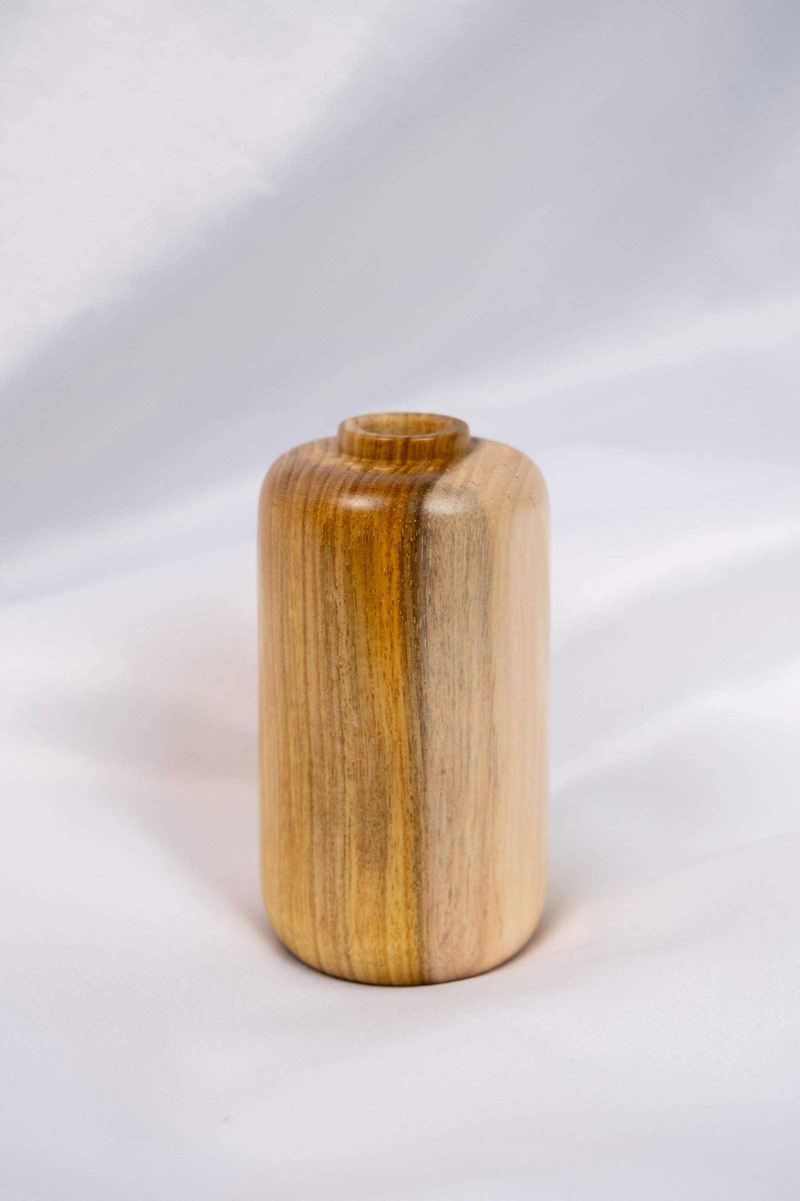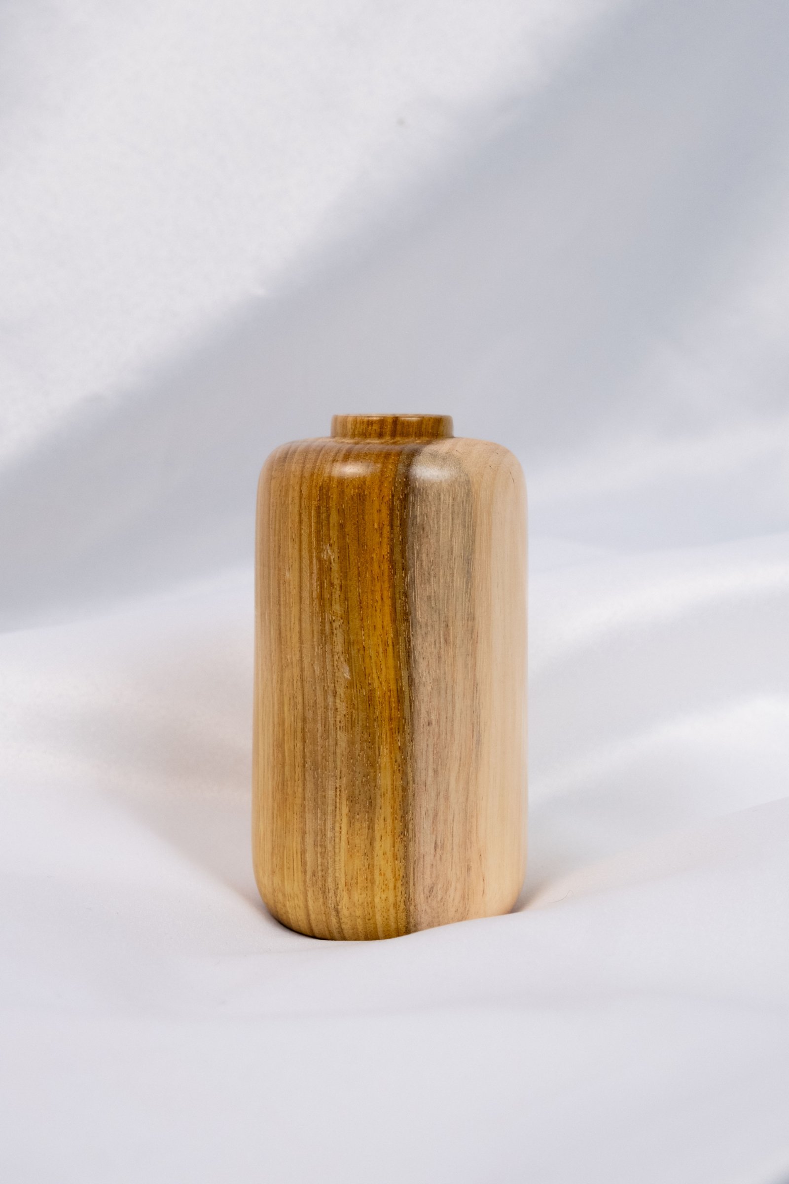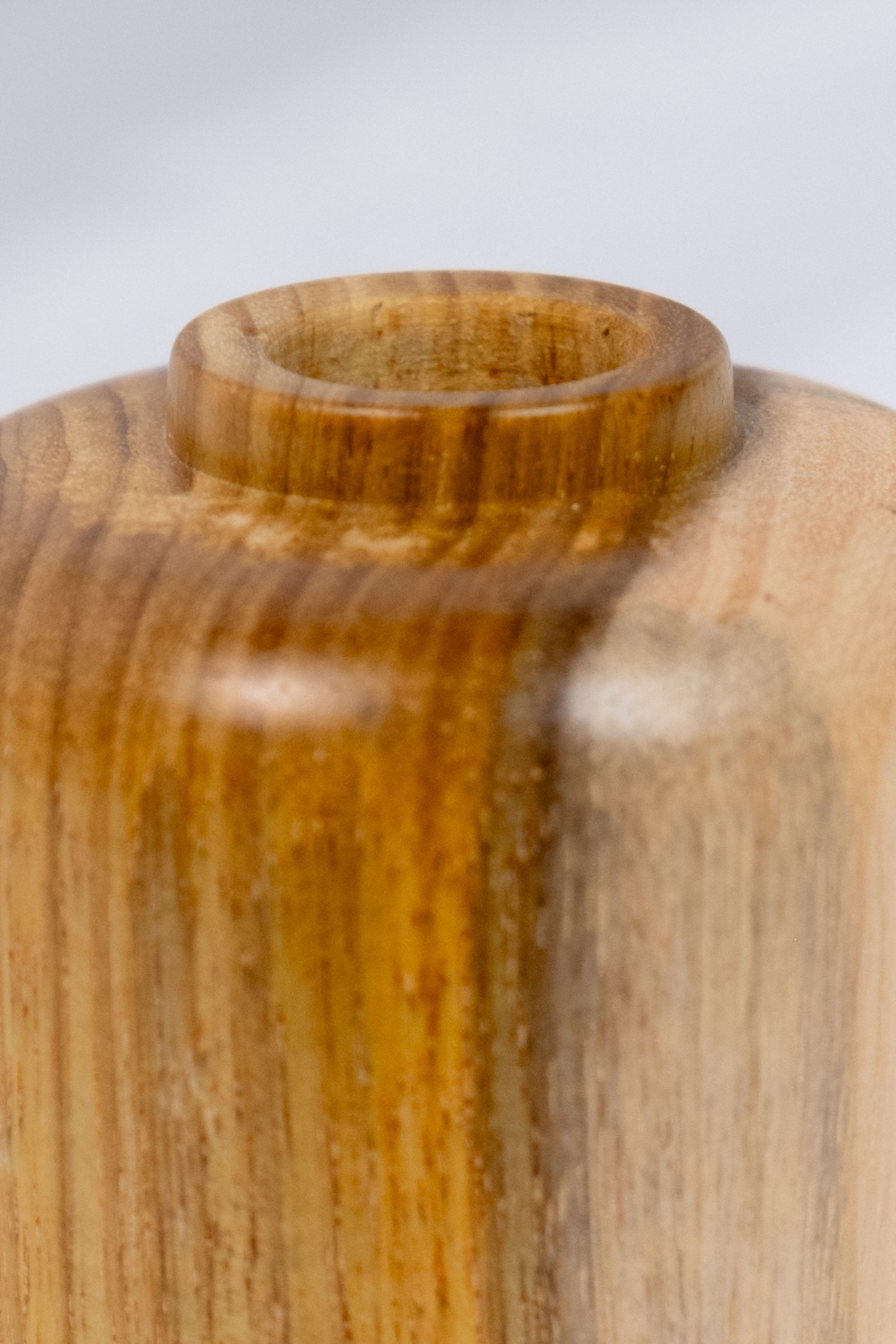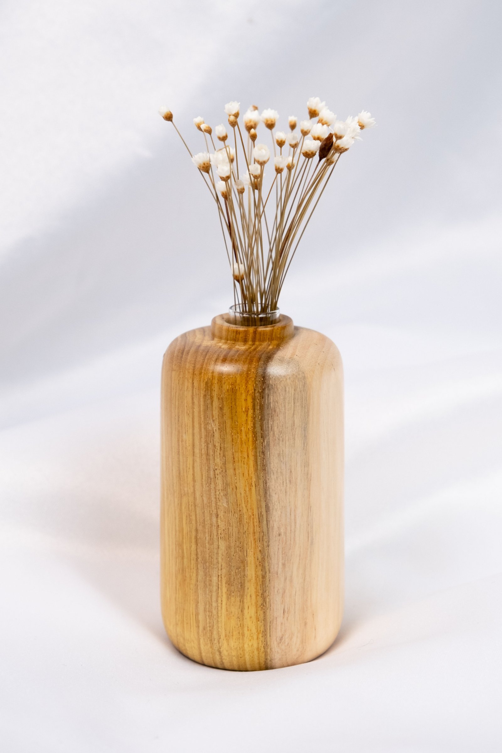 Vaso de Madeira Iracema é manualmente torneado em madeira de Araribá por uma artesã de Santa Catarina. Acabamento feito com seladora e cera de Carnaúba e possui suporte de vidro interno para colocar água. Medidas: ALtura 11cm Circunferência 19cm