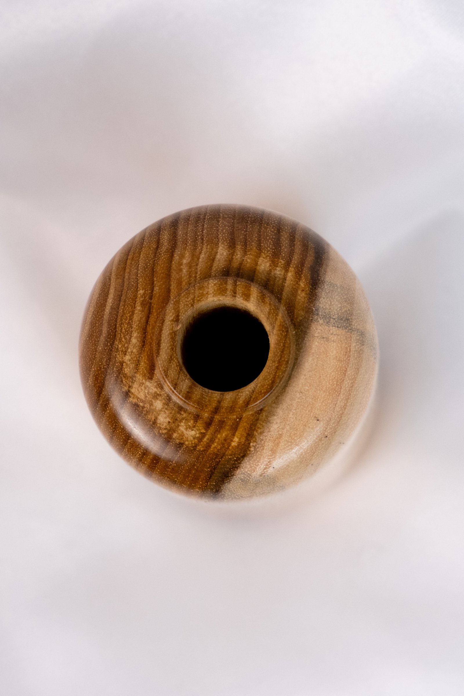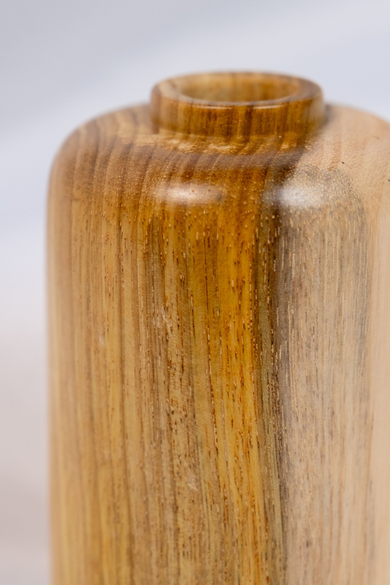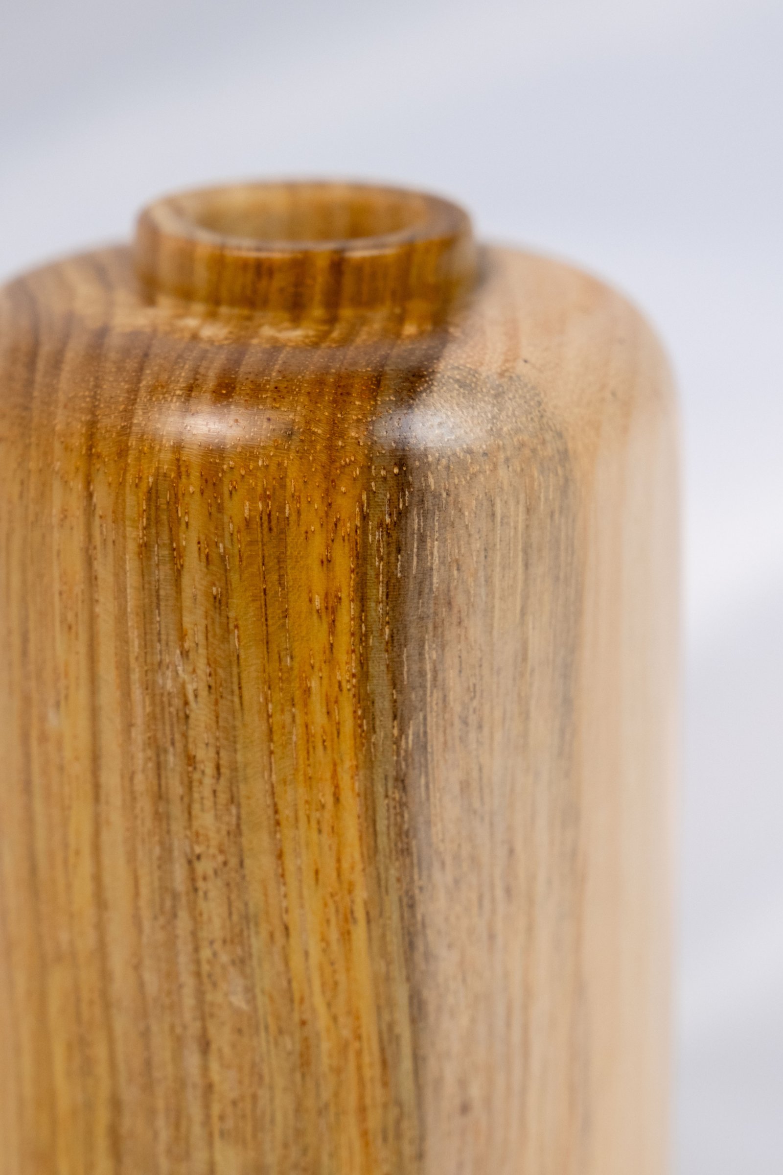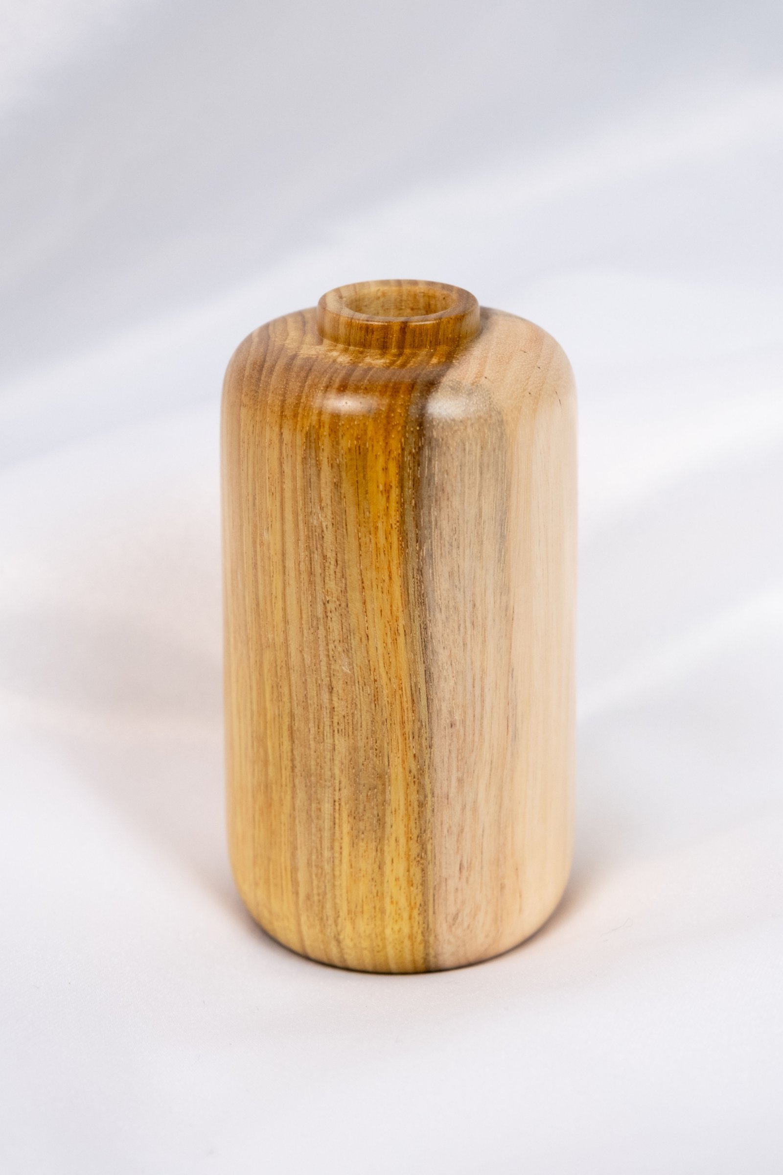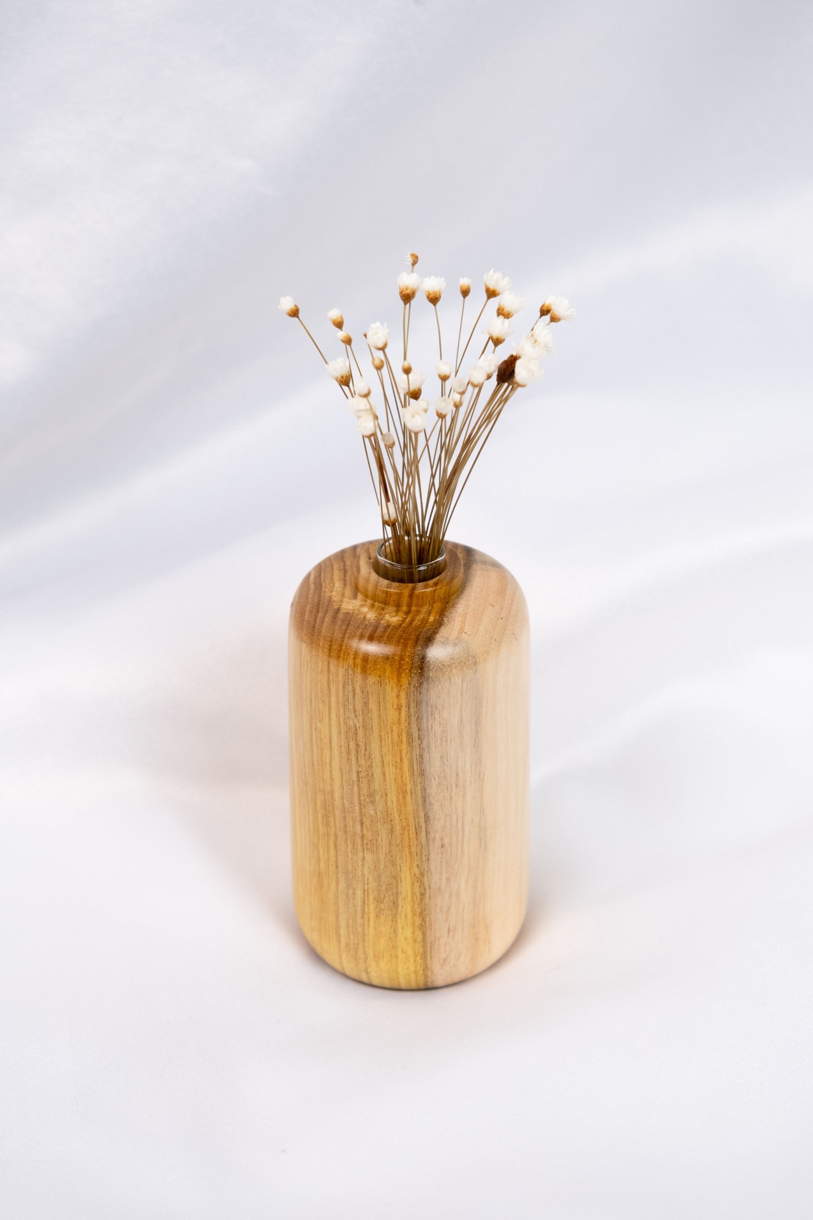 Vaso de Madeira Iracema é manualmente torneado em madeira de Araribá por uma artesã de Santa Catarina. Acabamento feito com seladora e cera de Carnaúba e possui suporte de vidro interno para colocar água. Medidas: ALtura 11cm Circunferência 19cm
