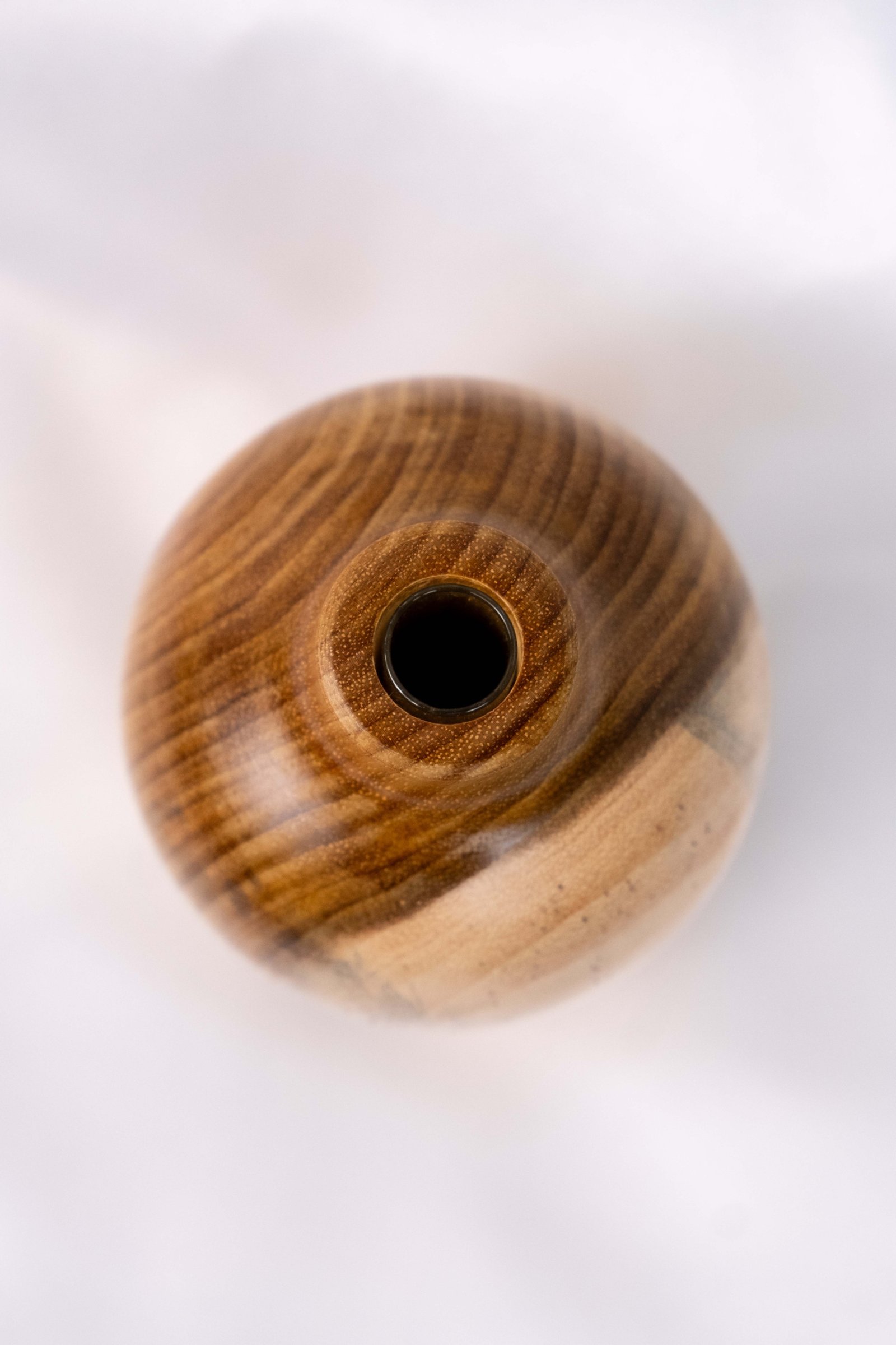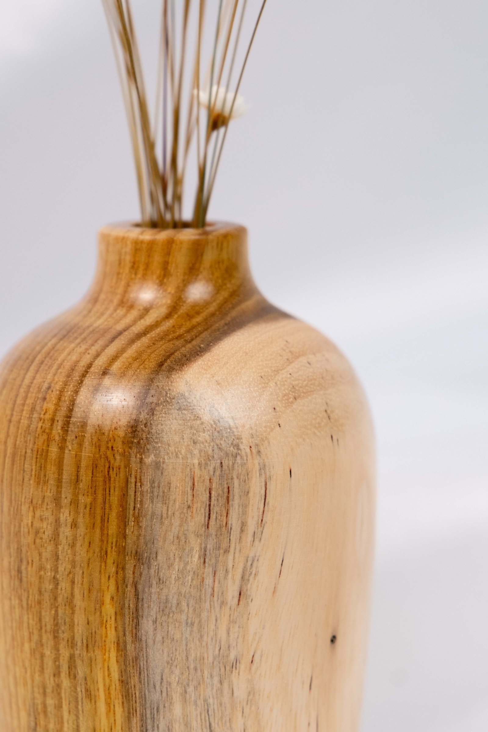 Vaso de madeira manualmente torneado em madeira de Araribá por artesã de Santa Catarina. Acabamento feito com seladora e cera de Carnaúba, possui suporte de vidro interno para colocar água.