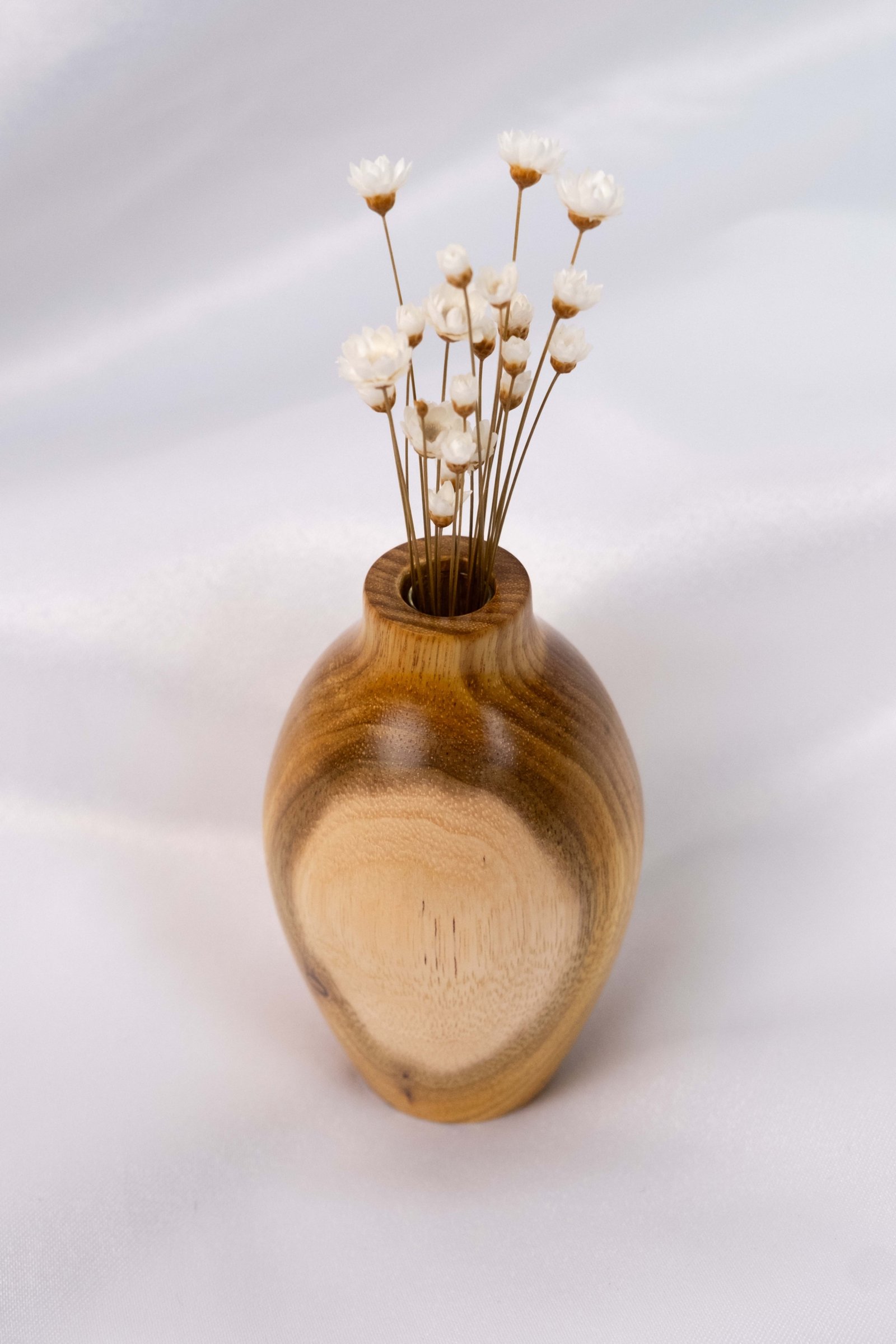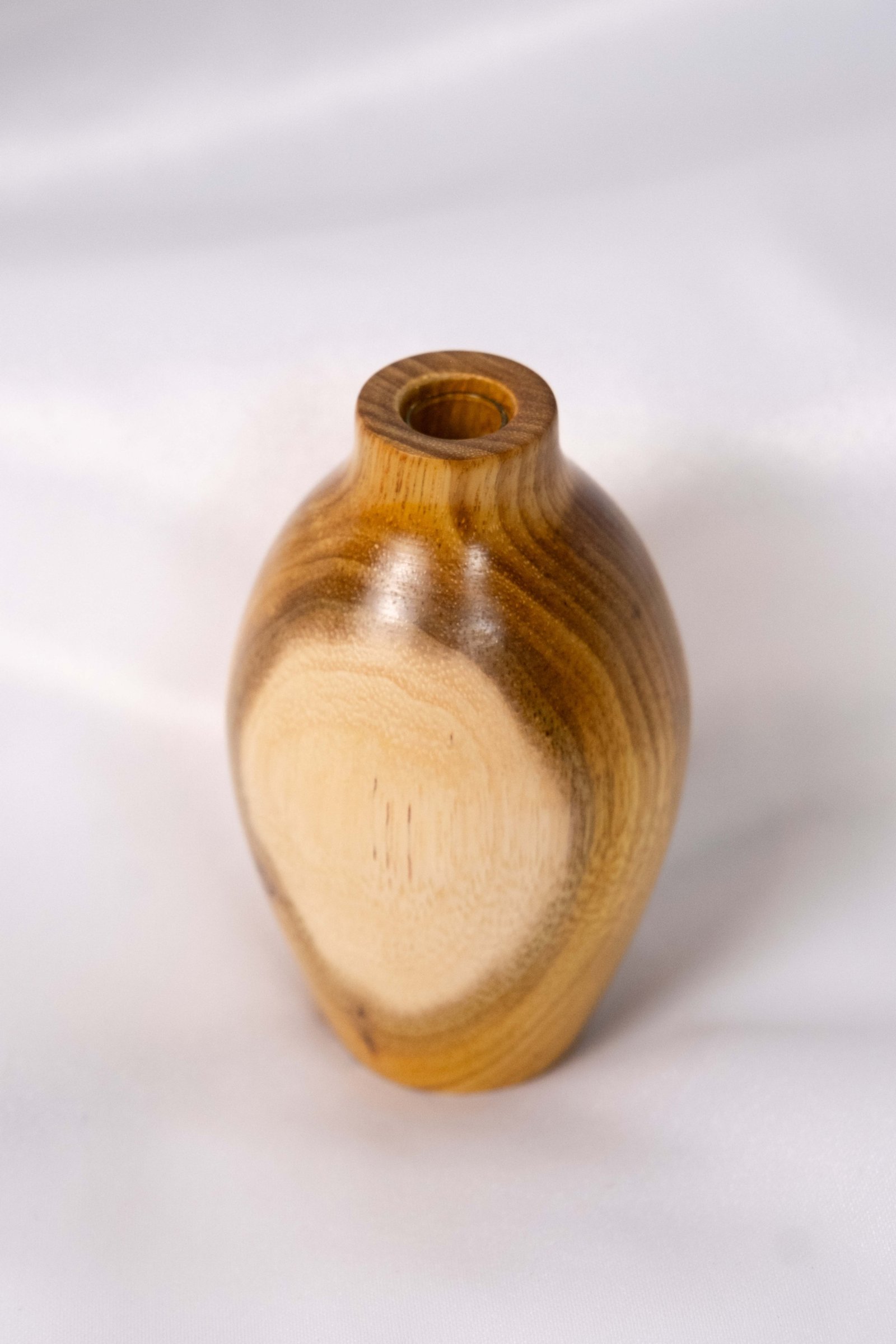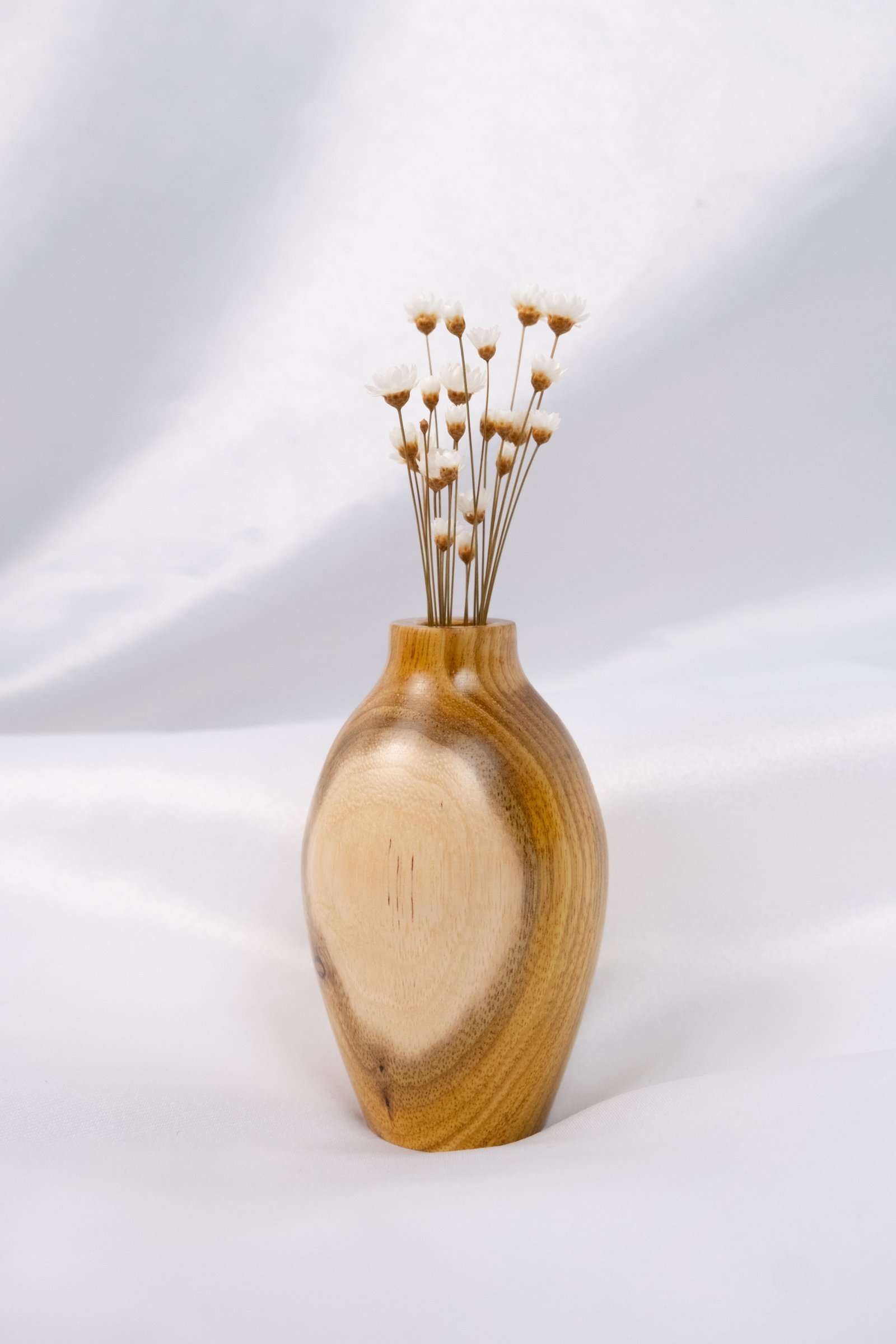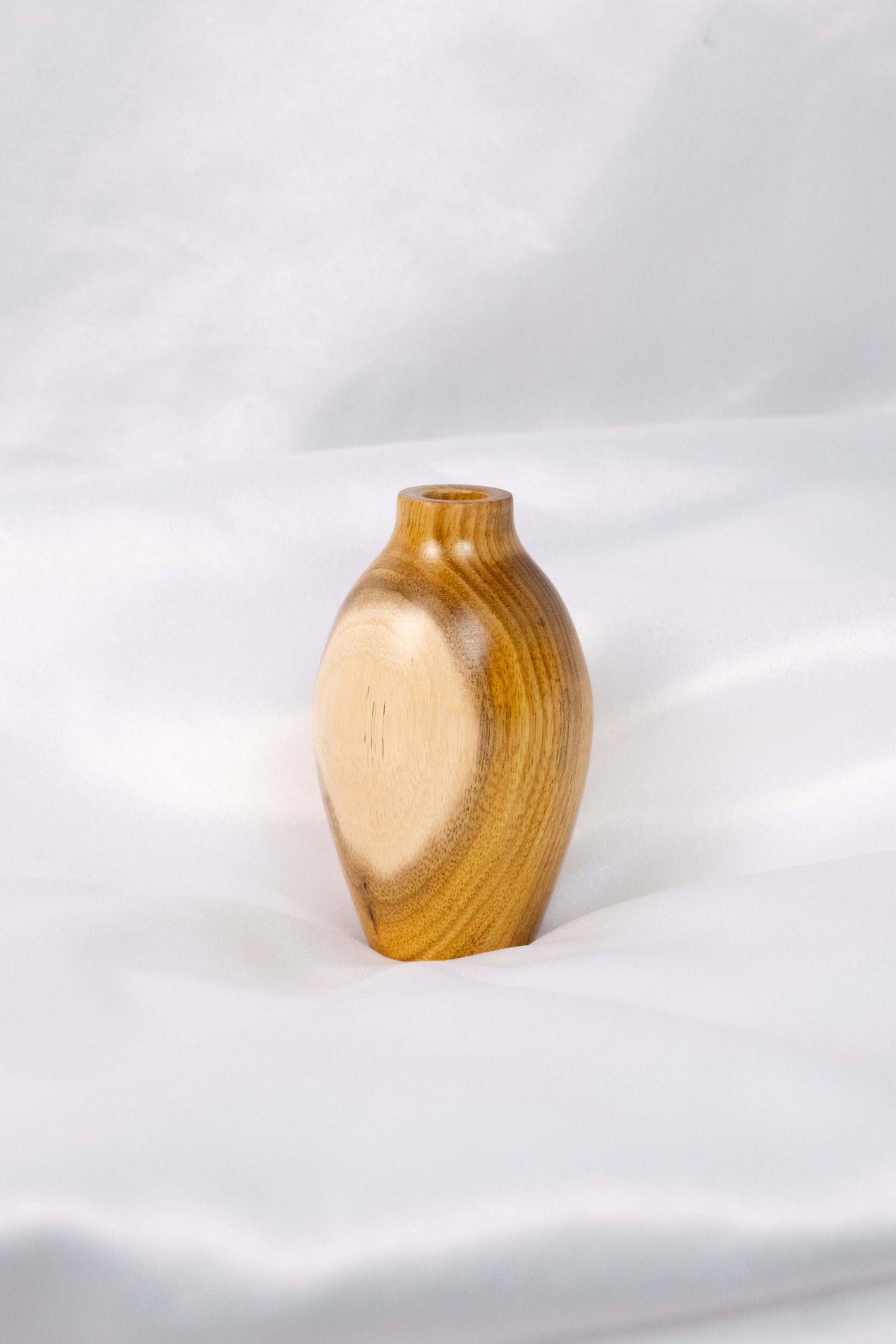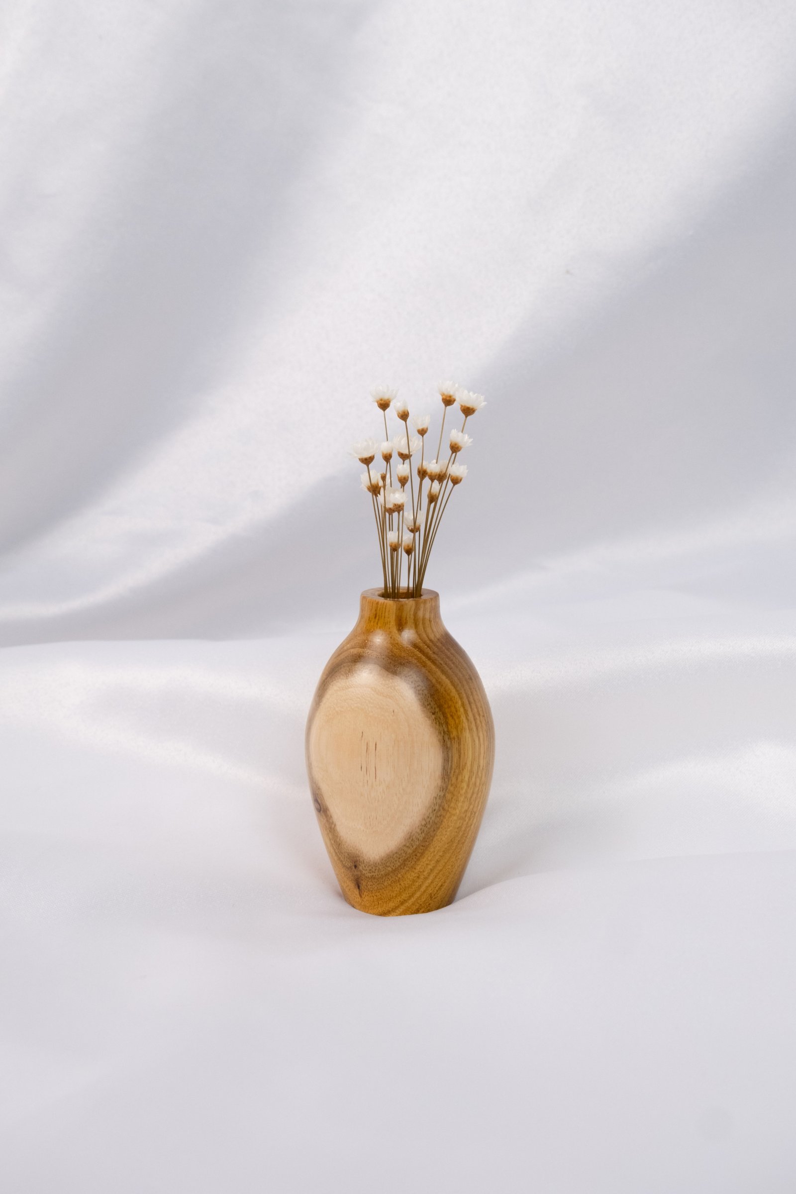 Vaso de madeira manualmente torneado em madeira de Araribá por artesã de Santa Catarina. Acabamento feito com seladora e cera de Carnaúba, possui suporte de vidro interno para colocar água. Medidas: ALtura 10cm Circunferência 18cm